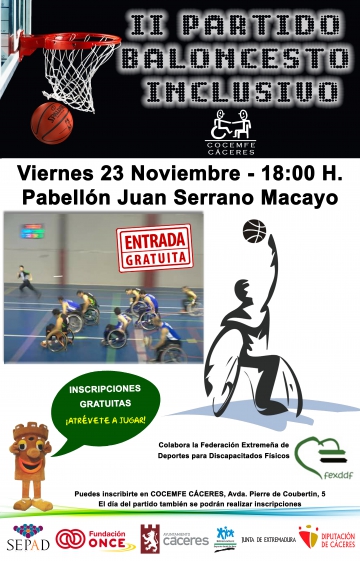 El próximo viernes día 23 de noviembre tendrá lugar la II Edición del Partido de Baloncesto Inclusivo. La actividad está organizada por COCEMFE CÁCERES, y contará con la colaboración de la Federación Extremeña de Deportes de Discapacitados Físicos (FEXDDF).